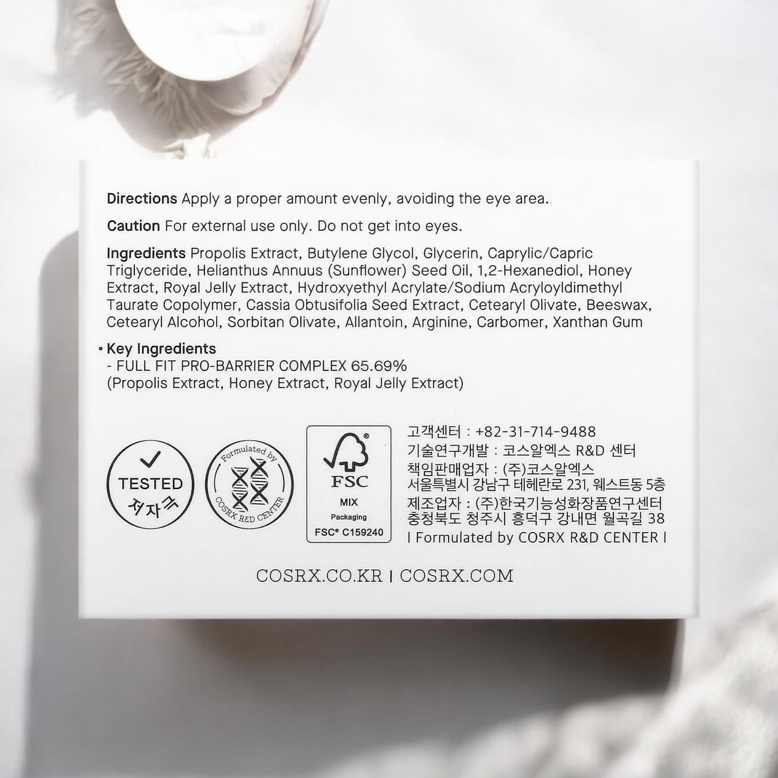 Key Ingredients - Full fit pro-barrier complex 65.69% (Propolis Extract, Honey Extract, Royal Jelly Extract).